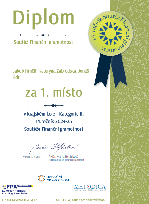 Další skvělá zpráva! Náš tým ve složení Kateryna Zabrodska, Jonáš Edr a Jakub Hrnčíř dokázal na výbornou odprezentovat svoji práci zaměřenou na dětské účty, čímž uhájil své 1. místo z krajského kola. Teď je čeká poslední výzva v podobě celostátního finále, které se koná v Praze v České národní bance.
