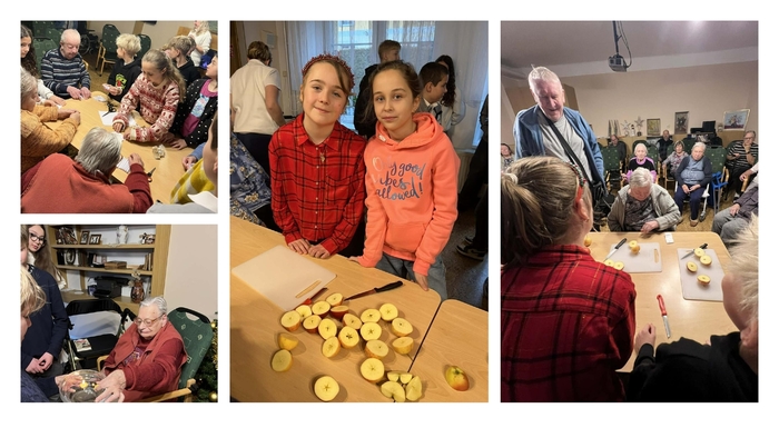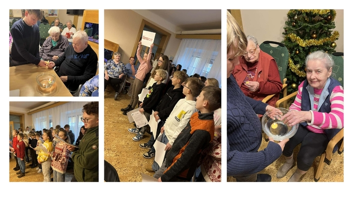 Ve středu, 3. 12. 2025, navštívili žáci ze školního parlamentu domov důchodců v Mlázovicích. Pro babičky a dědečky jsme si připravili pěvecké vystoupení nejznámějších vánočních koled, přednes vánočních básniček, hádanek, a někteří vystoupení oživili hrou na klavír, na flétnu či sólo zpěvem. Senioři dostali zpěvníčky a spousta z nich podpořila svým zpěvem naše parlamenťáky. Následně jsme si povídali společně o tradicích, a ty známé, jako je například pouštění lodiček či rozkrajování jablíček, si žáci s důchodci vyzkoušeli. Na všechny vykoukla po rozkrojení jablka hvězdička, tudíž jsme se všichni radovali a úsměv na tváři neskrývali. Po tradicích následovala tvořivá činnost, kde si senioři, za pomoci dětí, vyrobili andílky ochránce, kteří jim zdobí pokoje. Na závěr roznesli naši školní Ježíšci všem uživatelům dárečky, které ve škole sami vyrobili. Společně strávený čas jsme si moc užili, děkujeme za příjemnou vánoční atmosféru, kterou jsme všichni společnými silami vytvořili. Těšíme se na příští rok, až budeme moci opět přijet rozveselit všechny tváře.
